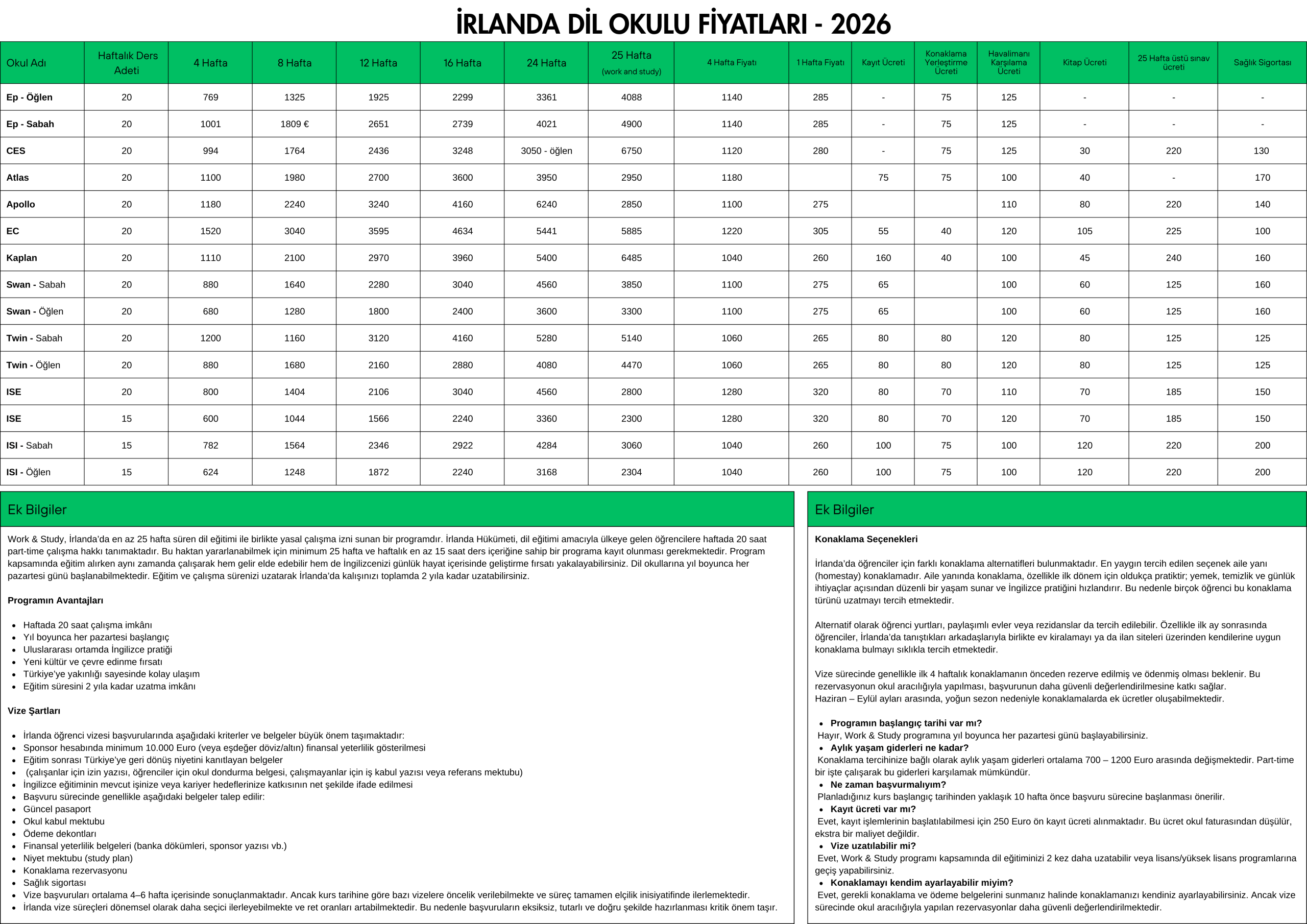 İrlanda'da dil okulu ve konaklama fiyatları ne kadar?